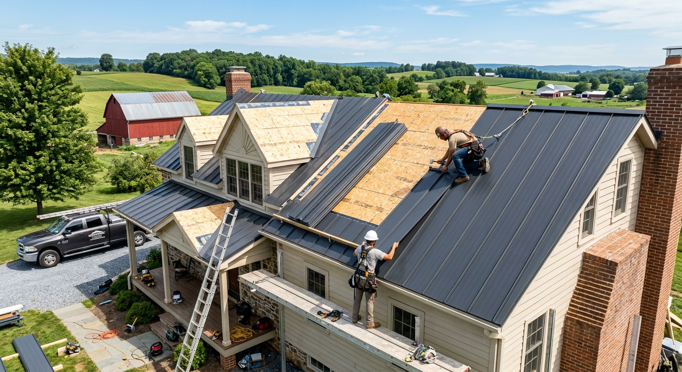 Standing seam and corrugated metal roofing systems installed by certified contractors in Kennett, PA. Lifespan 40-70 years, energy-efficient, low maintenance.