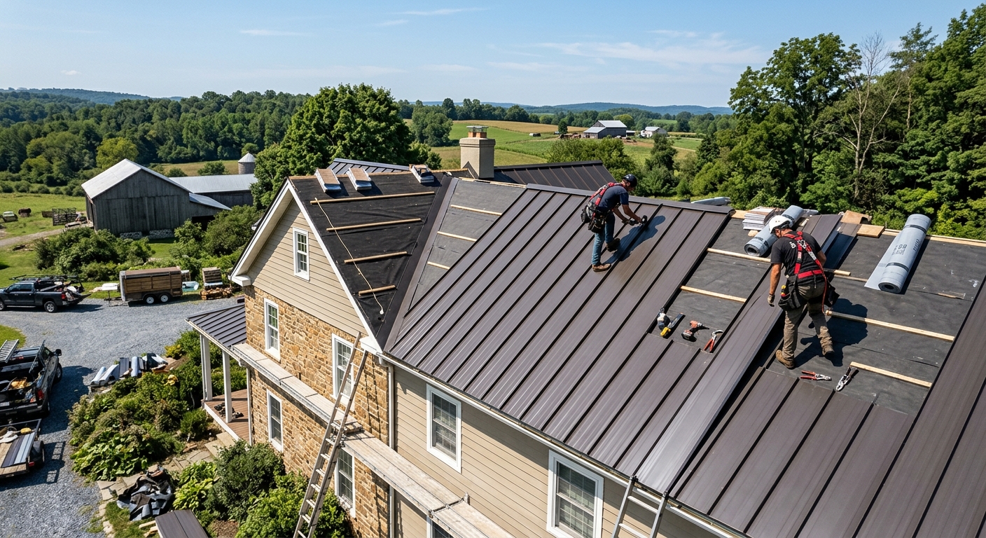 Standing seam and corrugated metal roofing systems installed by certified contractors in Lancaster, PA. Lifespan 40-70 years, energy-efficient, low maintenance.